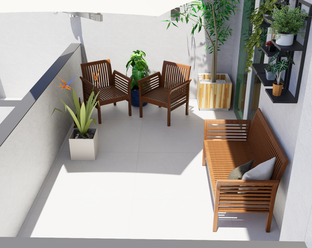 Em seguida, criamos o layout, selecionamos as plantas mais adequadas para o clima de Curitiba, indicamos materiais e entregamos todas as orientações para a execução.